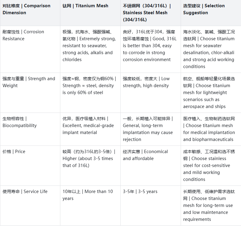 Many users will be hesitant to choose between titanium mesh and stainless steel mesh. The following is a core comparison for quick decision-making: